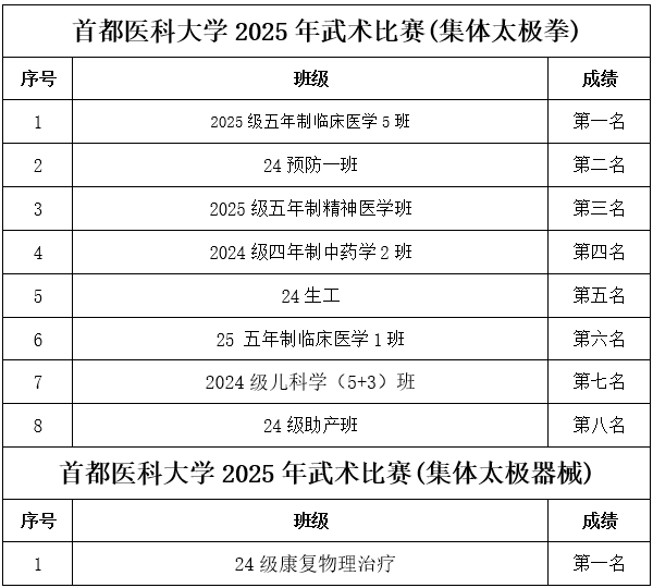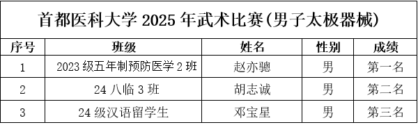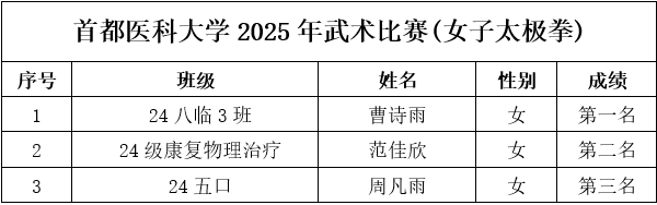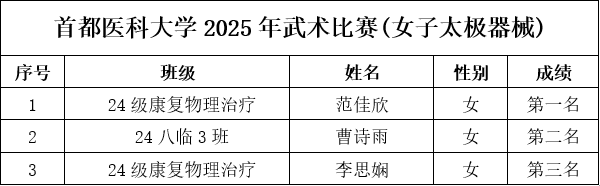 为保障赛事专业、规范、顺畅运行,组委会严格执行竞赛规程与组织要求:比赛采用中国武术协会审定的传统武术套路竞赛规则;赛前检录、场上秩序、成绩记录等环节均按流程推进。 作为医性爱直播 校,首都医科大学始终重视学生身心健康与全面发展。太极项目所蕴含的整体观、平衡观、调息观与中医养生理念高度契合,强调“形正、气顺、神宁”,既能强身健体,也能调节压力、涵养心性。此次武术比赛将传统体育项目与校园文化建设相结合,为医学生在紧张学业之余提供了良好的运动与交流平台,引导同学们在“知行合一”的实践中增强体质、磨炼意志、提升审美与文化认同。 经过激烈角逐,比赛现场掌声不断,选手们在个人和集体项目中都展现出了高度的专注与扎实的基本功。无论是动作的精准度、节奏感,还是团队配合的默契程度,都体现了同学们刻苦训练的成果与对中华武术的热爱。最终,各项目的获奖选手和团队脱颖而出,成绩令人瞩目,具体名次如下表所示,充分展示了首都医科大学学生的青春风采与拼搏精神。